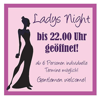 Sie werden dann in unsere Mailingliste aufgenommen und erhalten Nachricht sobald die nächste Ladys Night stattfindet. Rufen Sie unverbindlich an, um den nächsten Ladys Night-Termin zu erfahren oder buchen Sie selbst eine Ladys Night!